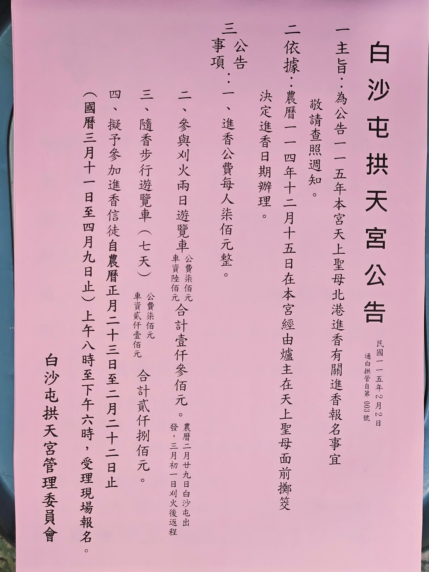 3、兩天刈火遊覽車(僅適合白沙屯當地人參加北港「刈火行程」)訂位車資600元+公費700元,計1300元。日期是農曆2/29出發北港,農曆3/1返回白沙屯。